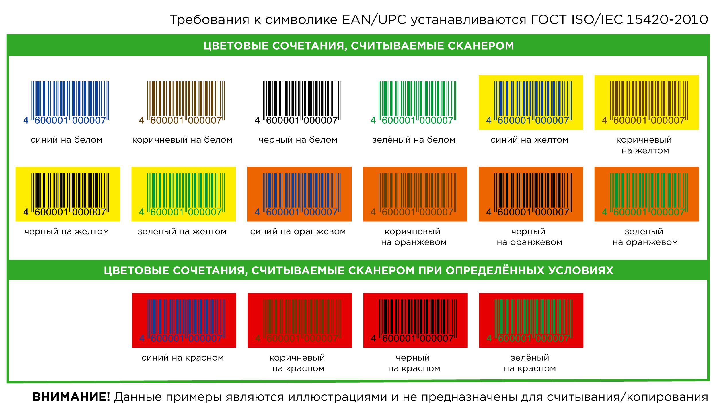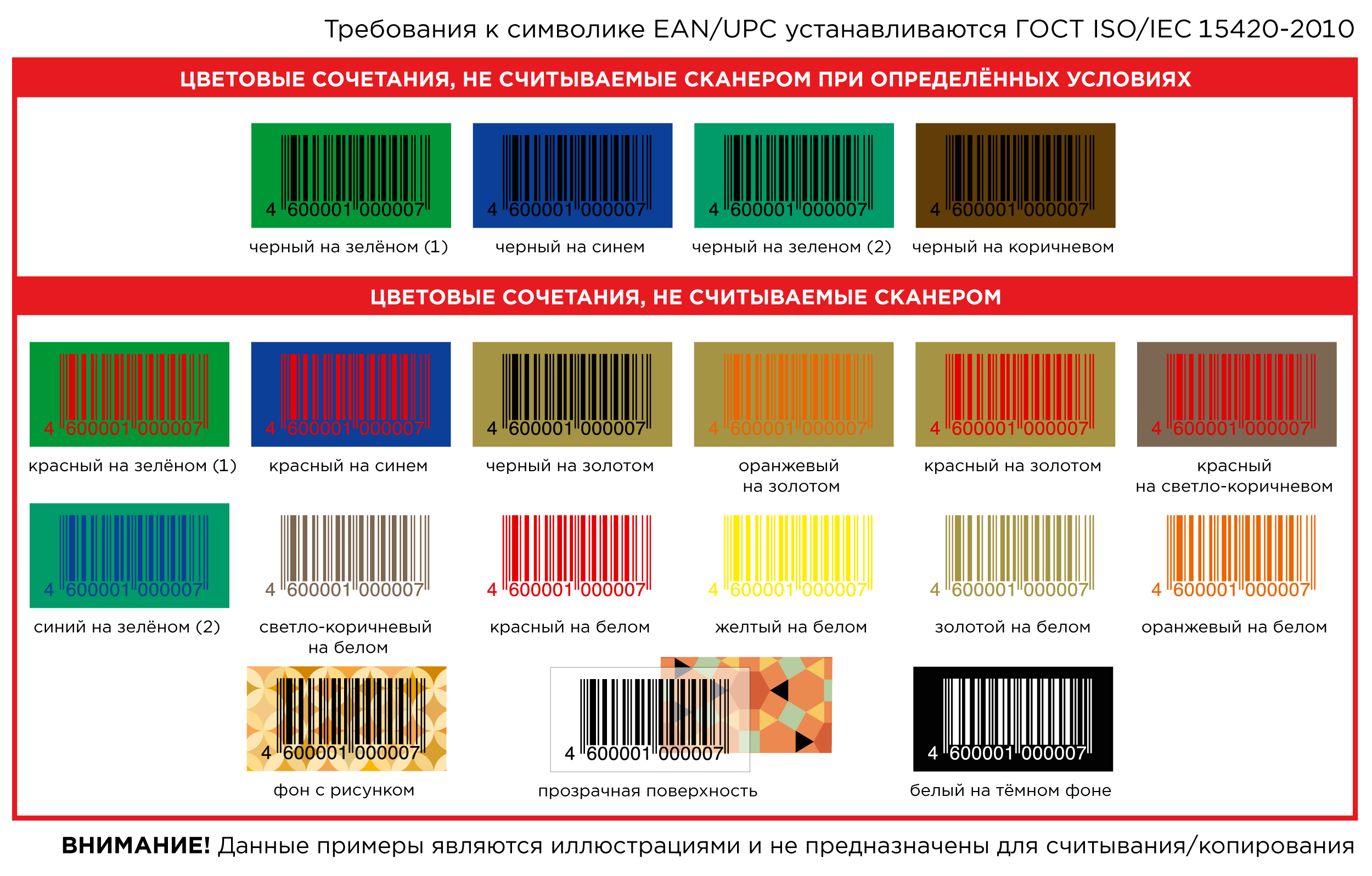 Оптимальным цветовым сочетанием для символа штрихового кода являются черные штрихи на белом фоне (фон включает пробелы и свободные зоны). Если вы хотите использовать другие цвета, следующие рекомендации помогут вам выбрать приемлемое цветовое сочетание (скачать PDF):